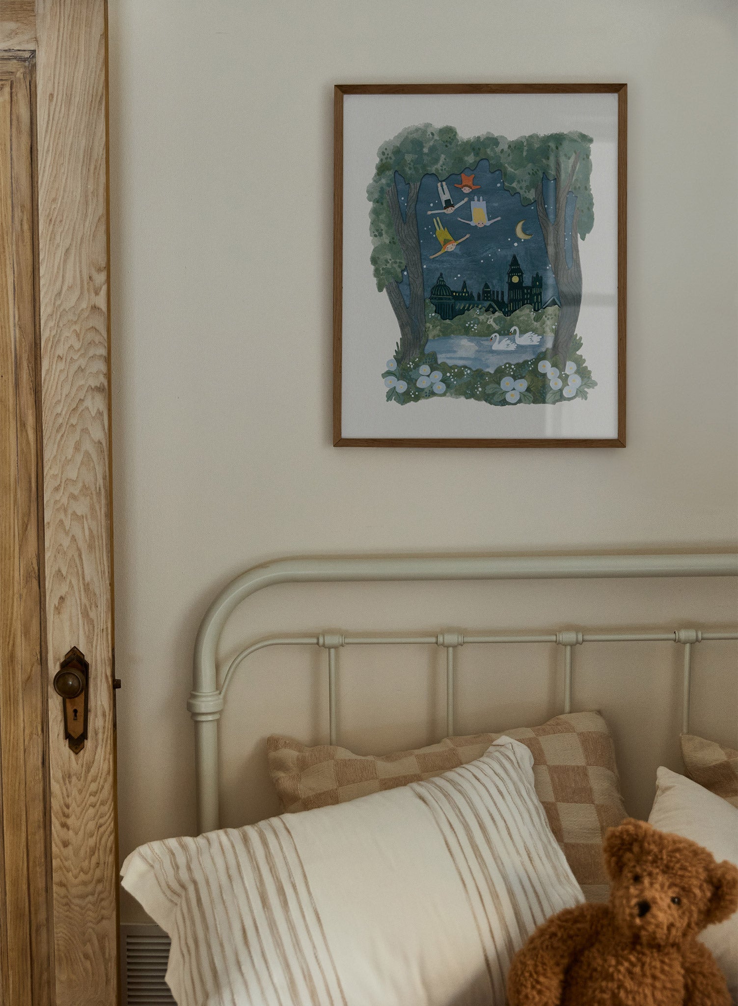 Nestled within a lush, moonlit forest, this enchanting print captures a whimsical scene of two children flying over a serene lake, with swans gliding gracefully below. The backdrop reveals a charming cityscape under a starlit sky, where a crescent moon hangs gently above. Framed by towering trees, the scene invites viewers to explore a world where imagination takes flight, offering a glimpse into a storybook adventure.