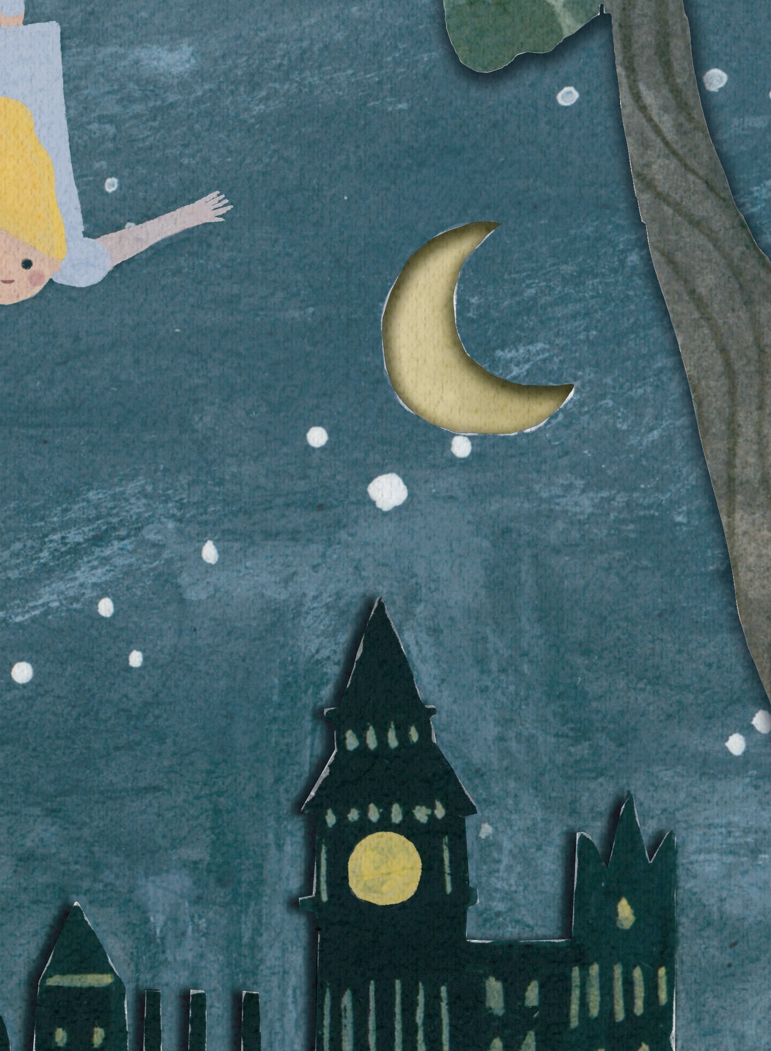 The print's rich palette of deep blues and greens is punctuated by soft whites and warm yellows, creating a harmonious balance that draws the eye. The textured brushstrokes add depth and a tactile quality, reminiscent of a handcrafted diorama. This layered effect brings the scene to life, making it feel as though the characters might soar right off the page, inviting a sense of wonder and discovery.