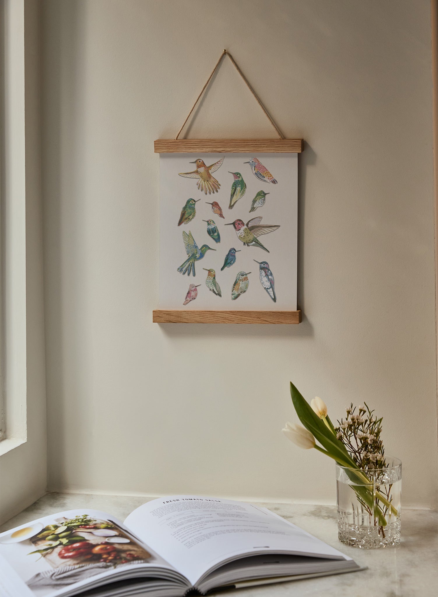 Ideal for a home office or a serene bedroom, this print brings a touch of nature indoors. Pair it with a simple wooden frame to complement its organic theme, or choose a sleek black frame for a modern contrast. Add soft linens or a ceramic vase nearby to enhance the tranquil atmosphere. This piece invites a moment of pause, a chance to admire the delicate beauty of these tiny avian wonders.