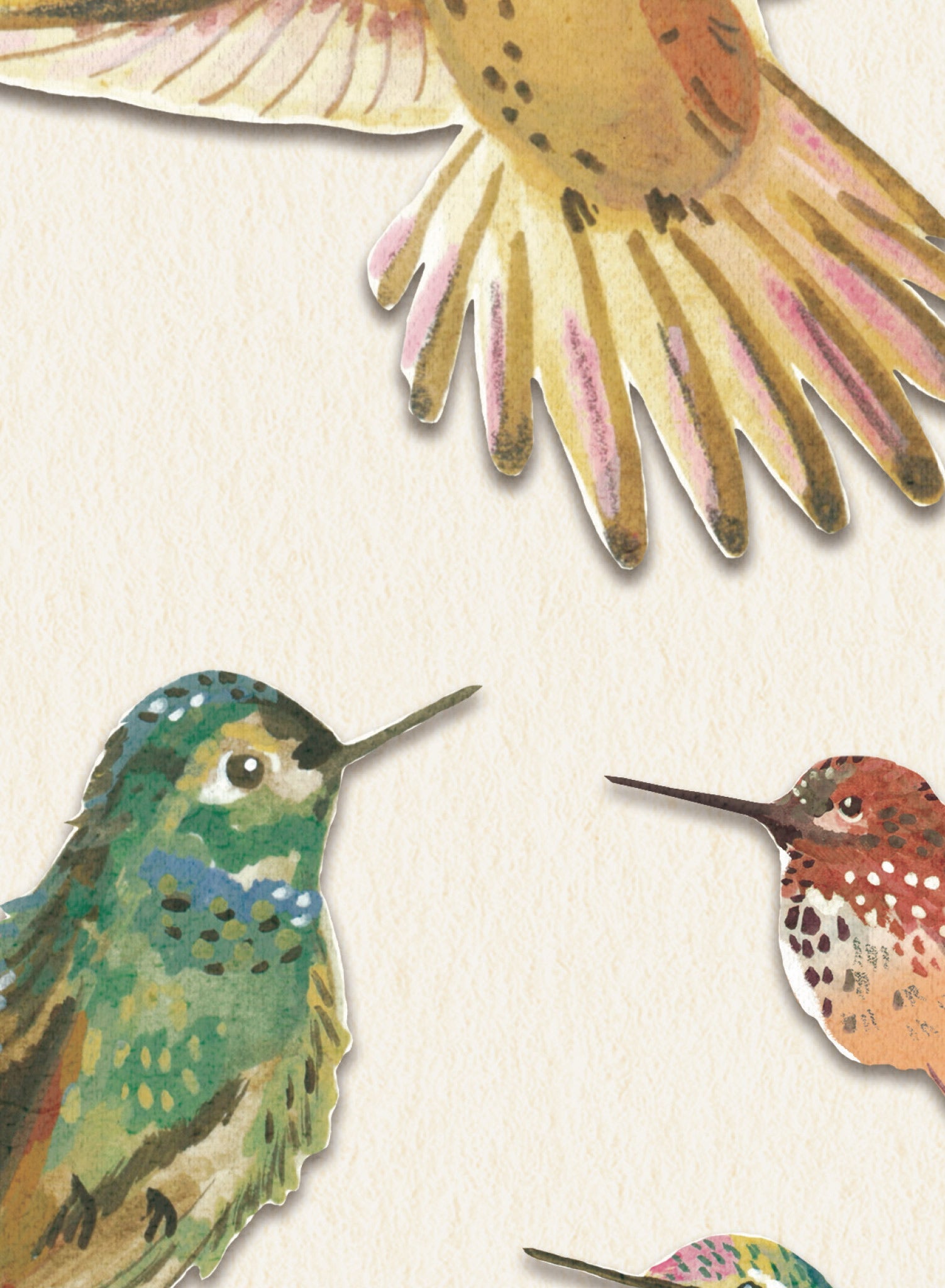 A vibrant gathering of hummingbirds graces this print, each bird captured in mid-flight or poised delicately, showcasing a spectrum of colours from emerald greens to soft pinks and deep blues. The birds are set against a creamy backdrop, allowing their intricate patterns and lively hues to take centre stage. Each feather is meticulously detailed, creating a sense of movement and life that draws the eye and sparks the imagination.